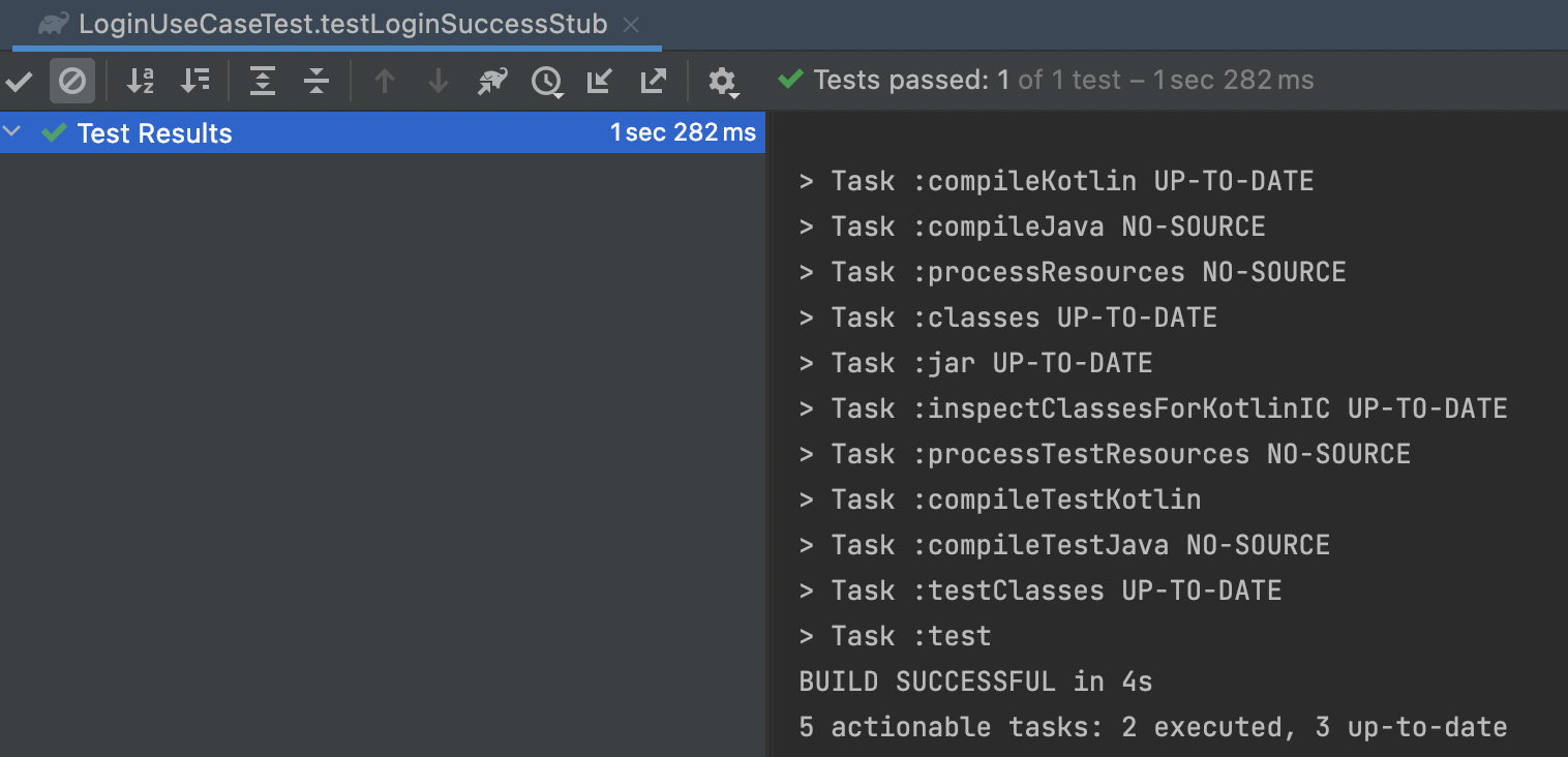 자 이제 해당 Stub을 이용해보자. loginUseCase.logIn(userName = "test", password = "test") 이 호출되면 이는 loginRepository로 login요청을 하고 LoginRepositoryResult.Success("test_token")를 반환받는다. 그리고 이는 LoginUseCaseResult.Success("test_token")로 변환되도록 위에서 설정되었다.