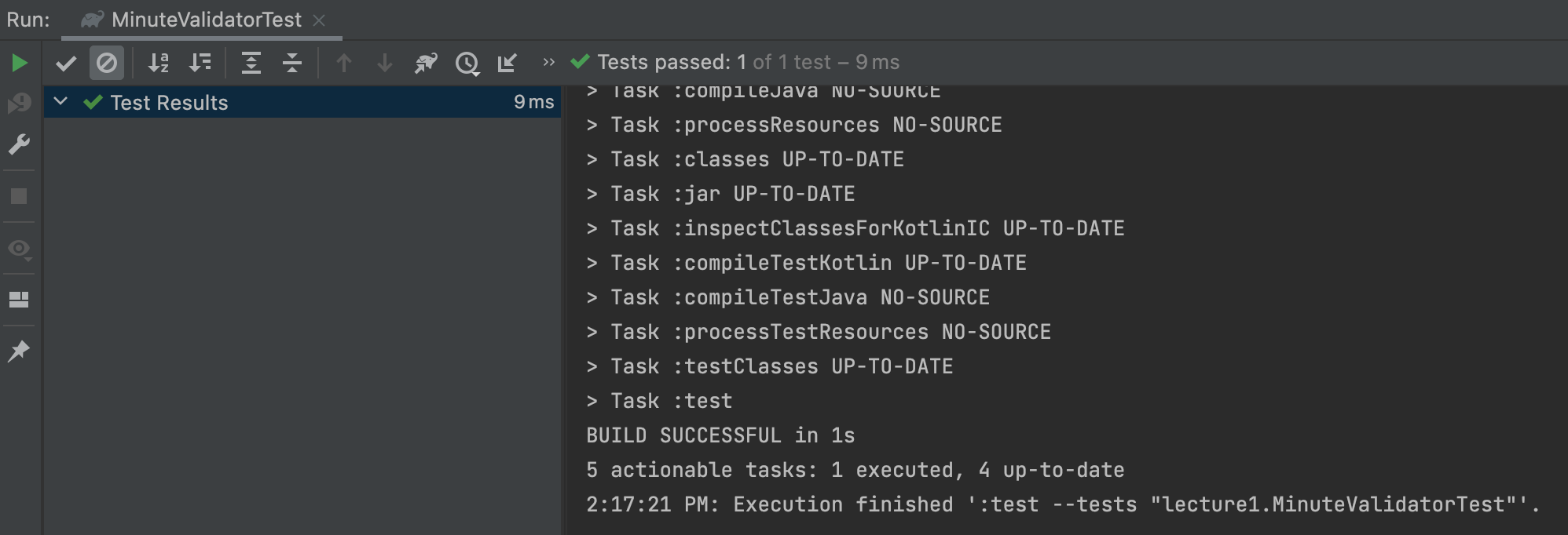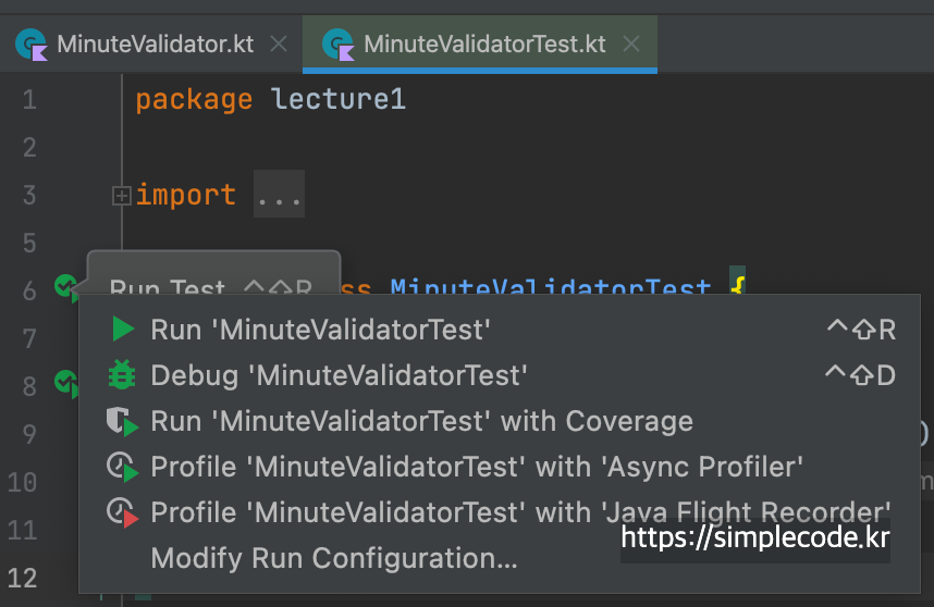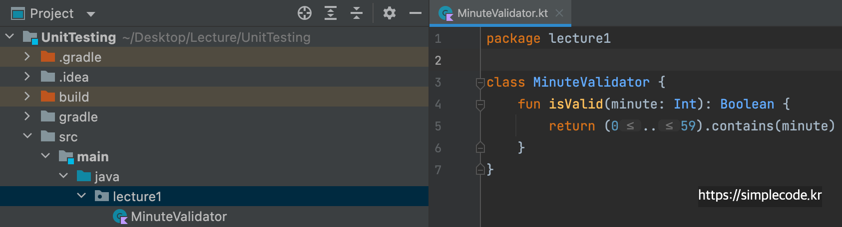 1. 간단한 테스트는 src/main/java/lecture1 경로에 MinuteValidator.kt 파일을 만드는 것으로 시작한다.