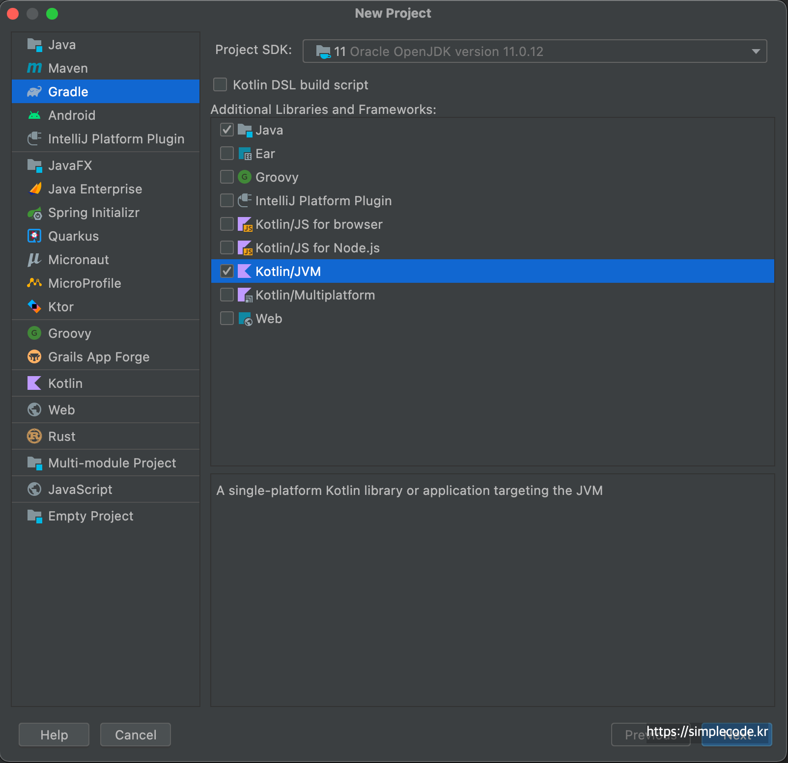 2. Gradle 탭으로 들어가 Java와 Kotlin/JVM에 체크 한 후 Next를 누른다