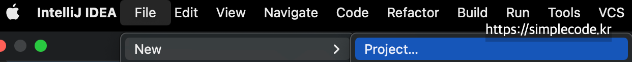 1. Intellij의 File - New 경로에서 Project... 을 누른다.