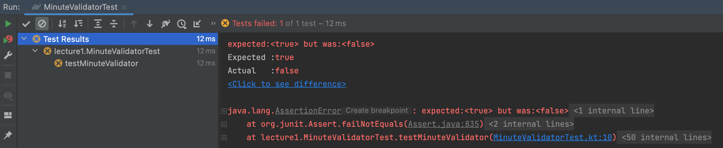 5. 이후 internal class MinuteValidatorTest의 왼쪽에 있는 아래 버튼을 누르면