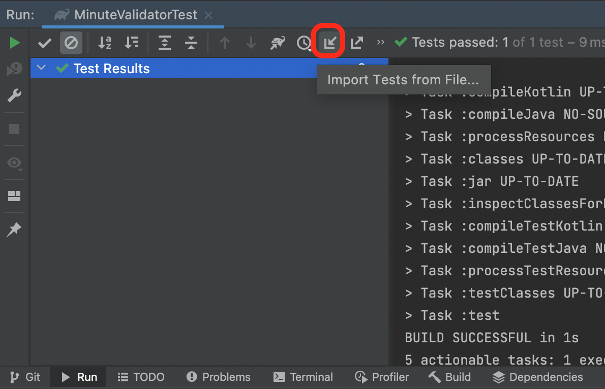 결과 파일을 저장했으면 다시 불러올 수도 있다. Import Tests from File 버튼을 누른 후
