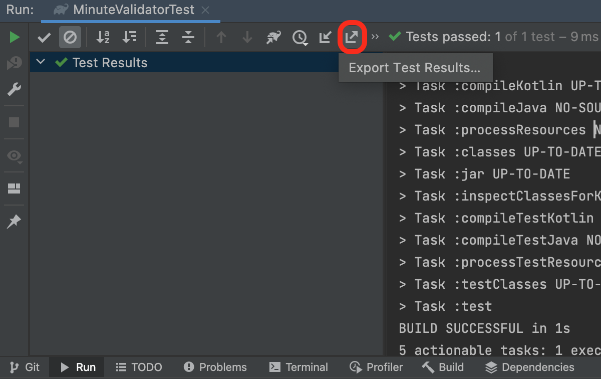 이 탭에는 여러 버튼들이 있는데 여기서 원하는 테스트를 클릭한 후 Open Gradle test report를 클릭하면 테스트 결과 리포트를 확인할 수 있다.