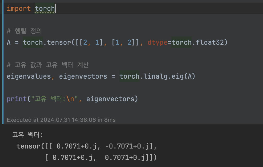 PyTorch를 사용해 고유값과 고유벡터를 구하기 위해서는 linalg.eig 함수를 사용하면 된다.