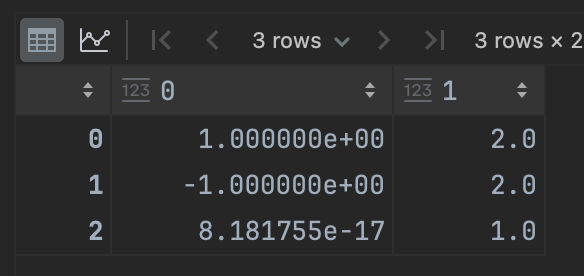 그러면 다음과 같은 값이 나온다. 여기서 세번째 값이 매우 작은 값으로 0인 것을 볼 수 있으니, 고유값에 루트를 취한 값은 3.0과 1.414인 것을 볼 수 있다.