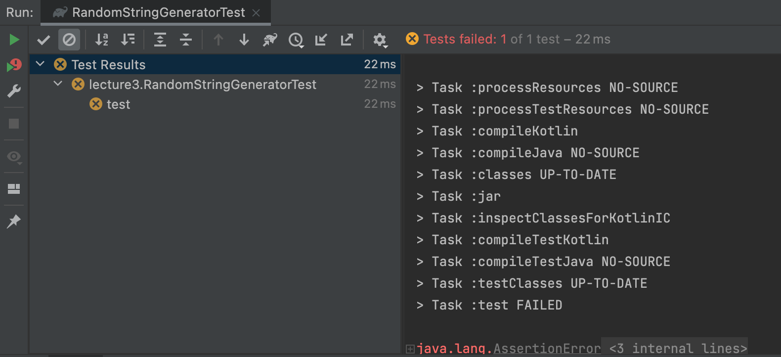 하지만 이 테스트가 실패한 것은 RandomStringGenerator의 generate 메서드의 오류로 인해 생긴 것이 아니다. 바로 RandomStringGenerator에 의존성이 있는 class KoreanRandomCharacterFactory : RandomCharacterFactory 의 구현 오류로 인해 생긴 것이다.
