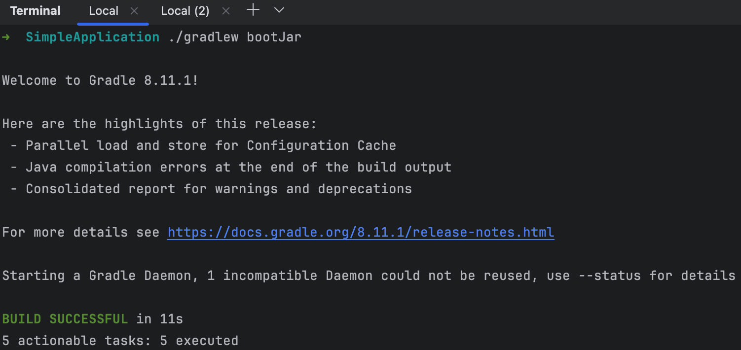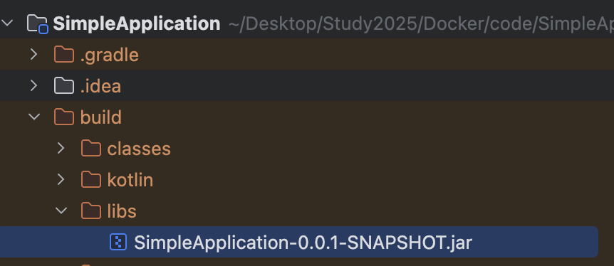 빌드가 성공했으므로 build/libs/SimpleApplication-0.0.1-SNAPSHOT.jar 파일이 생긴 것을 볼 수 있다.