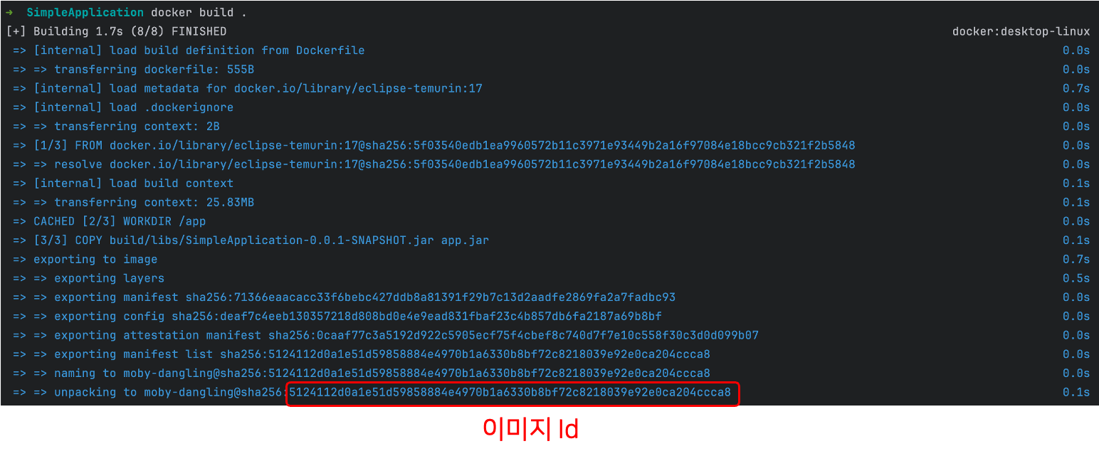 이 명령어가 입력되면, 이 디렉토리 내부의 Dockerfile을 모두 찾아 이미지를 만들며 만들어진 이미지의 아이디는 빌드 마지막 줄의 : 이후의 값을 통해 확인할 수 있다.