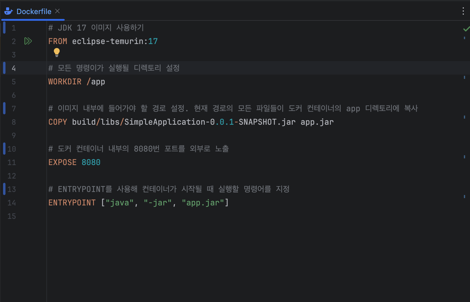 컨테이너가 실행되는 환경은 격리된 공간으로 실제 기기의 환경과 완전히 격리되어 있다. 스프링 애플리케이션은 기본적으로 8080번 포트에서 실행되므로 이 포트를 열어야 함을 명시해야 이후 이미지를 실행할 때 어떤 포트를 열어야 하는지 명확히 할 수 있다. 이를 위해 EXPOSE 8080을 적어 놓아 어떤 포트를 열어야 할지 명확히 한다.