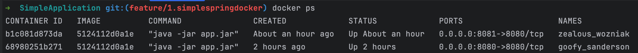 컨테이너의 이름은 docker ps의 맨 마지막 열의 NAMES에서 확인할 수 있으며 중지하면 더이상 해당 컨테이너가 docker ps로 조회되지 않는다.