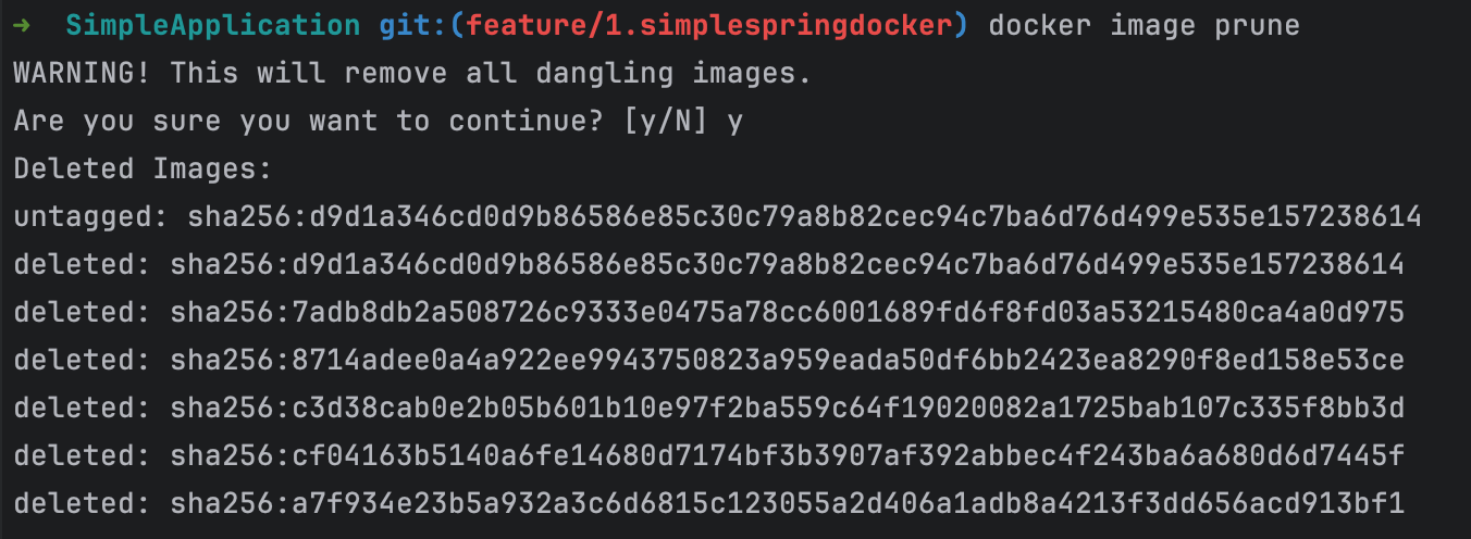 prune이란 '가지치기' 혹은 '정리'라는 뜻으로 더이상 사용되지 않는 이미지를 정리하는 것을 뜻한다. 이 명령어를 사용할 경우, 이미지로 만들어진 컨테이너가 없는 경우 모두 정리된다.