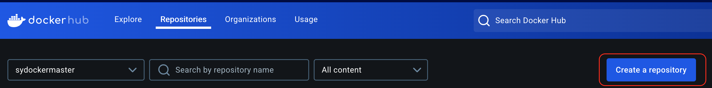 Docker Hub에 이미지를 배포하기 위해서는 먼저 Docker Hub에 저장소를 만들어야 한다. 저장소를 만들기 위해 Create a repository 버튼을 클릭한다.
