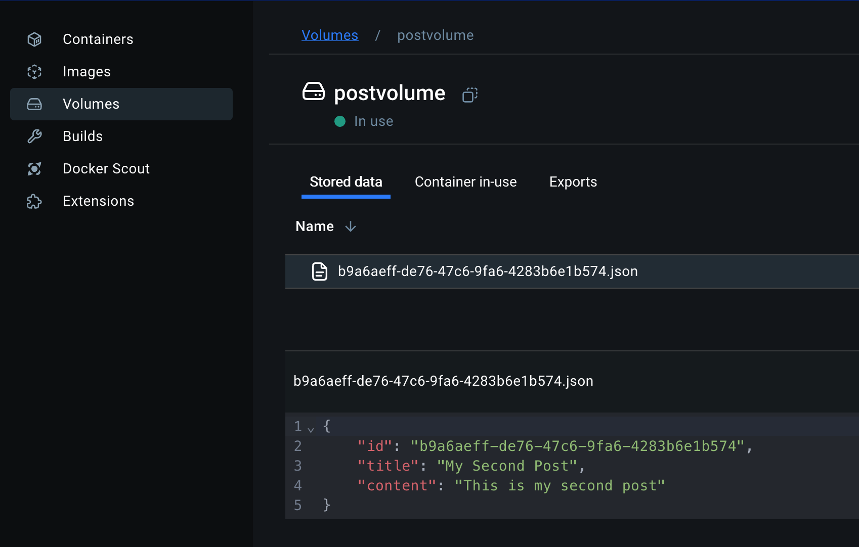 이제 docker desktop에서 postVolume을 확인하면 다음과 같이 포스트가 생성된 것을 확인할 수 있다.